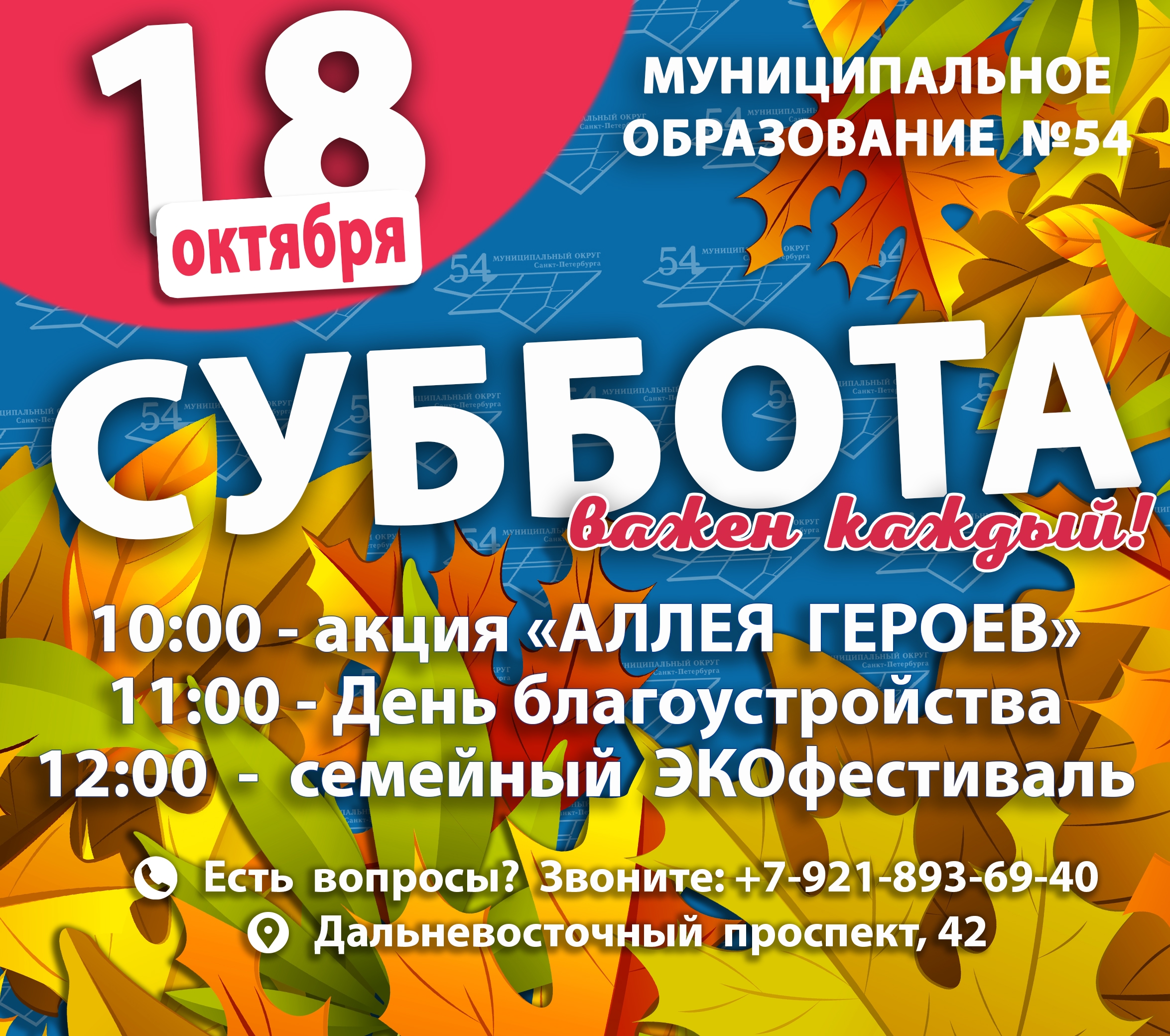 В 11:00 стартует осенний ДЕНЬ БЛАГОУСТРОЙСТВА. Сбор участников у входа в здание #МО54. Форма одежды – по погоде. Инвентарём обеспечим.