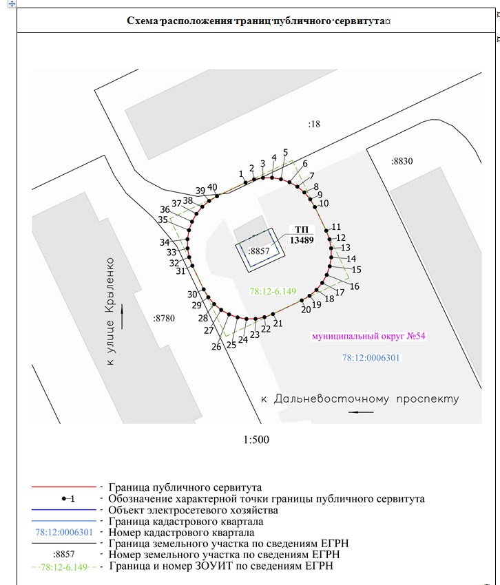 | 1 | Российская Федерация, Санкт-Петербург, внутригородское муниципальное образование Санкт-Петербурга муниципальный округ №54, улица Крыленко, участок 95 | 78:12:0006301:8857 | Публичный сервитут на 49 лет | Для целей предусмотренных п. 1 ст. 39.37 Земельного кодекса Российской Федерации. Эксплуатация объекта электросетевого хозяйства |