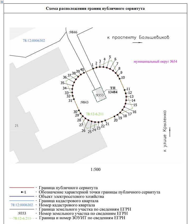 1 Российская Федерация, Санкт-Петербург, внутригородское муниципальное образование Санкт-Петербурга муниципальный округ № 54, улица Крыленко, участок 98 78:12:0006302:9353 Публичный сервитут на 49 лет Для целей предусмотренных п. 1 ст. 39.37 Земельного кодекса Российской Федерации. Эксплуатация объекта электросетевого хозяйства