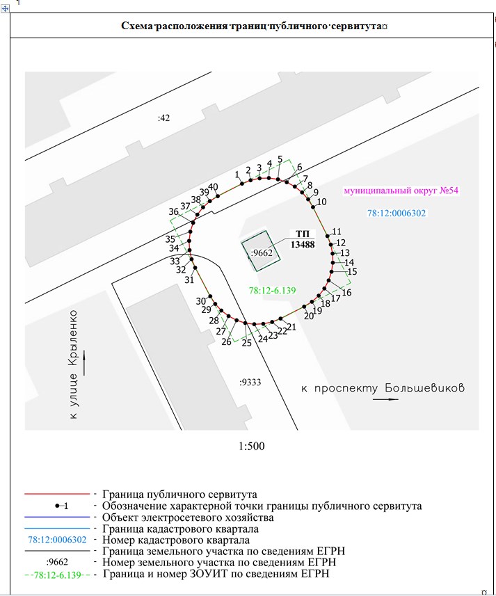 | 1 | Российская Федерация, Санкт-Петербург, внутригородское муниципальное образование Санкт-Петербурга муниципальный округ № 54, улица Крыленко, участок 94 (местоположение: Российская Федерация, Санкт-Петербург, внутригородское муниципальное образование Санкт-Петербурга муниципальный округ № 54, улица Крыленко, дом 29, корпус 2, литера З) | 78:12:0006302:9662 | Публичный сервитут на 49 лет | Для целей предусмотренных п. 1 ст. 39.37 Земельного кодекса Российской Федерации. Эксплуатация объекта электросетевого хозяйства |